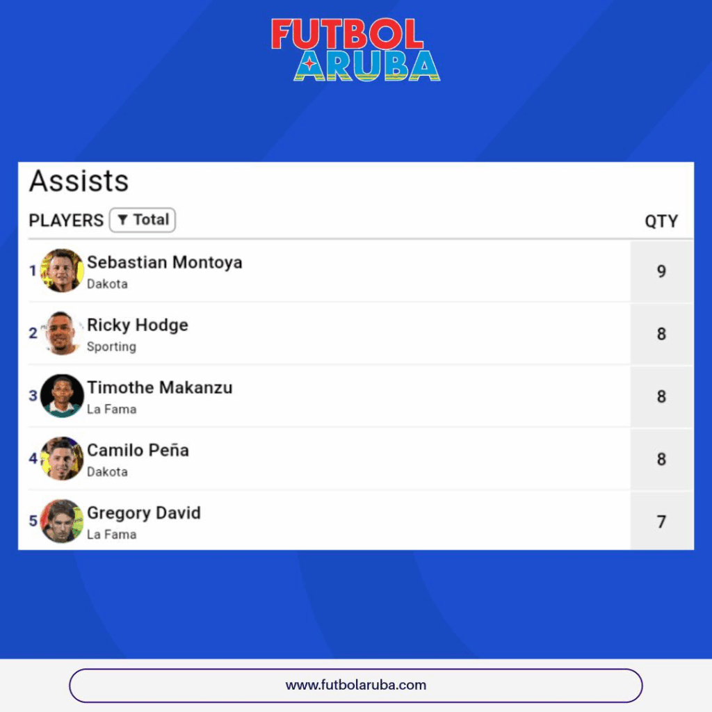 Sebastian Montoya di Dakota ta mantene prome lugar riba tabla di asistencia, pero competencia ta duro, Ricky Hodge di Sporting, Tomothe Makanzu di La Fama y Camilo Pena di Dakota ta net su tras riba tabla, Gregory David di La Fama tambe ta serca.