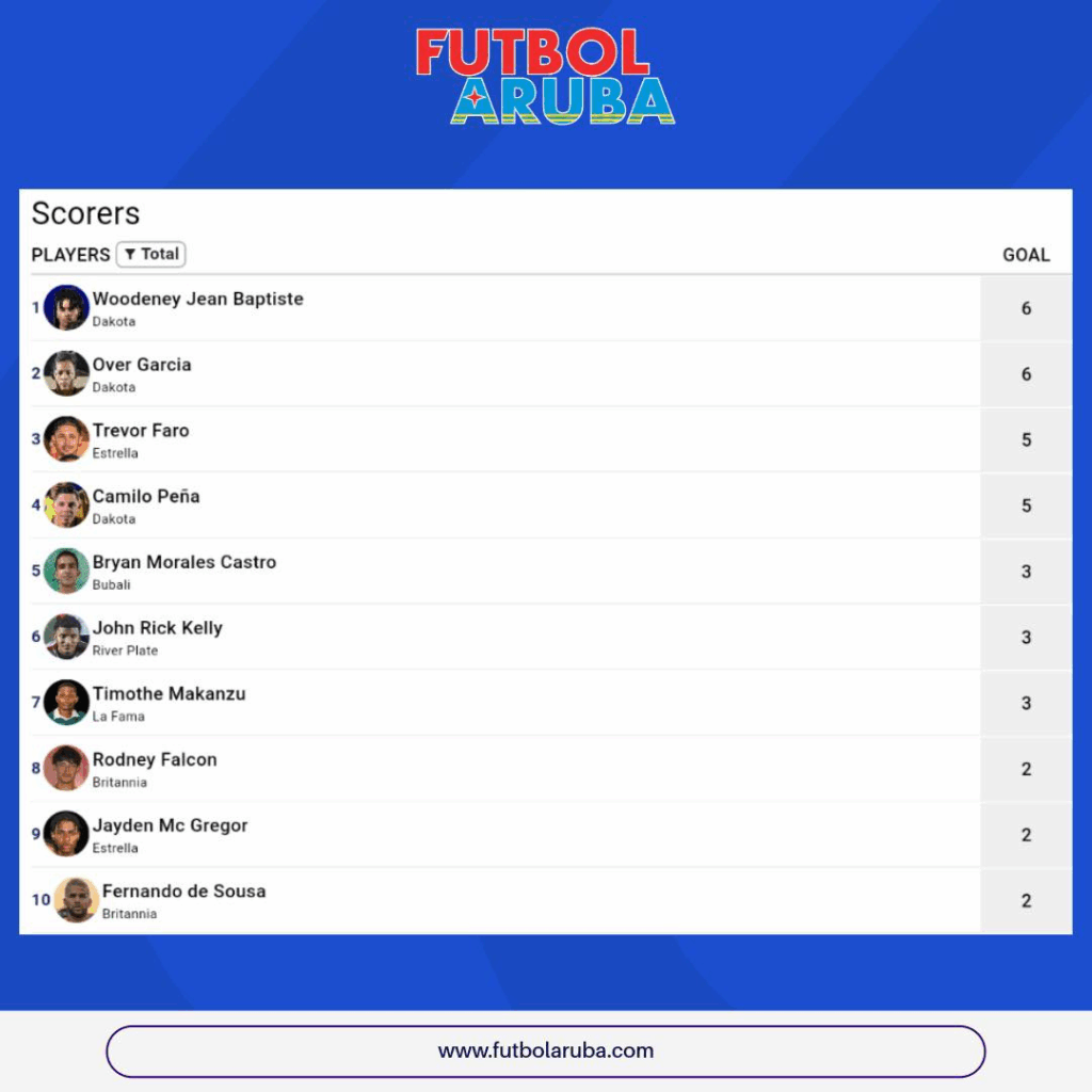Woodeney Jean Baptiste y Over Garcia ta e co-lidernan awor riba tabla di goleador di Division di Honor despues di victoria grandi contra Real Koyari den siman 4 unda Jean Baptiste a score 2 gol mas y Garcia un total di 4 gol den e wega. Trevor Faro di Estrella y Camilo Peña di Dakota tambe ta keda hopi serca, ambos cu 5 gol te cu awor den e campeonato.