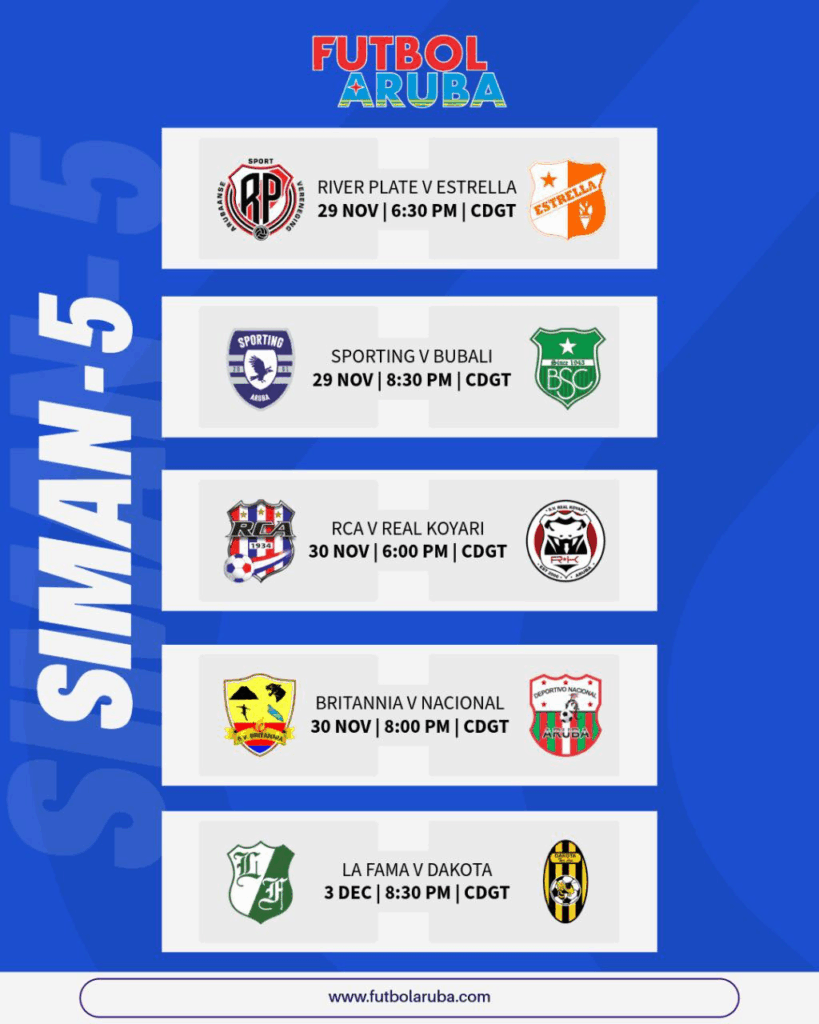 PARTIDONAN BENIDERO Partidonan di siman 4 – Division di Honor Alvaro Velasquez Theysen November 28, 2025 E partido di Diabierna La Fama v Dakota a move pa e siguiente Diaranson 3 December 8:30pm – Post navigation Previous Previous post: Seleccion femenino di Aruba ta rib’e drempel di cuminsa un fase nobo den ‘Concacaf 2025-2026 W Qualifiers’Next Next post: Aruba ta victorioso den su prome partido di “W Qualification” pa Mundial Brasil 2027, ganando Saint Kitts & Nevis 2-1 Leave a ReplyCancel reply Related News PARTIDONAN BENIDERO Division di Honor – Partidonan di Siman 5 November 25, 2025