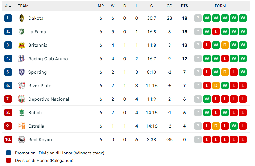 Dakota ta consolida mas ainda nan liderato riba tabla, Bubali ta sorprende Britannia c’un resultado “shocking” y hunto cu Nacional awor nan ta drenta den contencion pa top 6 hunto cu Estrella, River Plate y Sporting, cos ta preta.