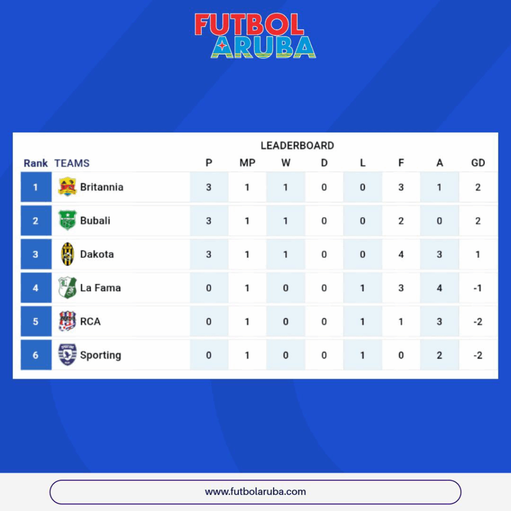 Nota: Top 6 ekiponan despues di e prome rond di weganan (9 siman) ta clasifica pa Liga Oro (Caya 6). E otro cuater nan lo hunga den Liga Plata (promocion-degradacion) hunto cu otro top 6 ekiponan di Division Uno. Den Liga Oro lo hunga un round robin, tur seis ekipo lo enfrenta otro, e top cuater lo hunga otro atrobe pa determina e top dos nan cu lo hunga e gran final.