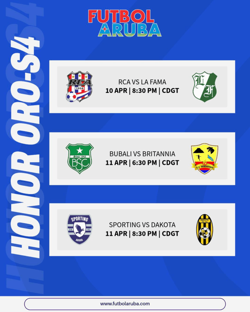 PARTIDONAN BENIDERO Division di Honor – Liga Oro – siman 4 Alvaro Velasquez Theysen April 10, 2026 – Post navigation Previous Previous post: Aruba ta sali campeon di e cuadragular FIFA Series di grupo B na RwandaNext Next post: Aruba ta perde 3-1 cu Panama den eliminatorio pa mundial 2027 – partido hopi competitivo Leave a ReplyCancel reply